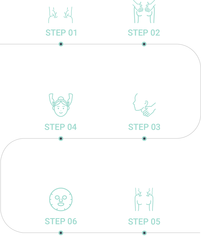 顔面神経と連携された頭皮の筋肉と、上部僧帽筋の筋肉を解し リフト手術の効果を極大化させ、維持させるプログラムになります。