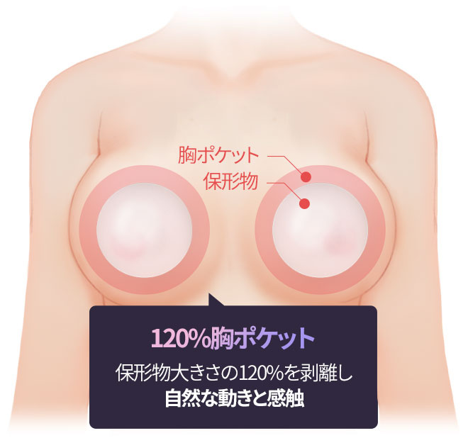 ドライポケットとは、出血なく保形物が入る空間を剥離するノウハウで保形物大きさの120%を剥離し、ドライポケットを作ると感触も自然ながら球形拘縮予防にも役に立ちます。