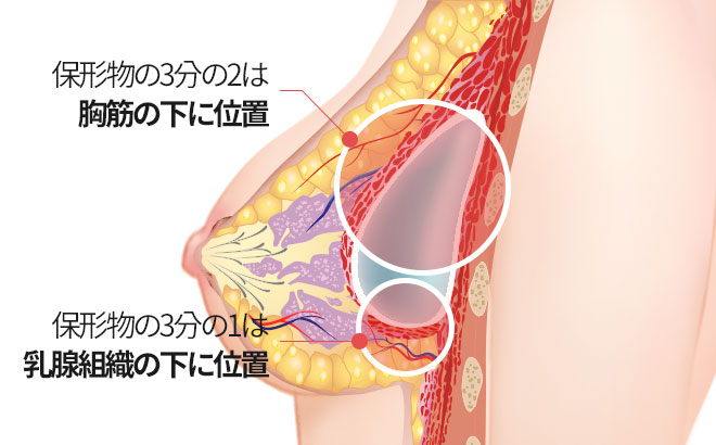 ほとんどの女性に適合な方式保形物上の部分は胸筋の下、