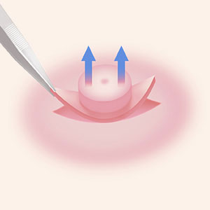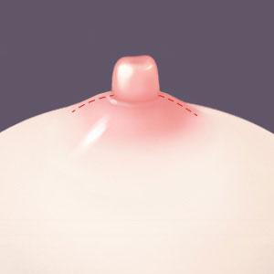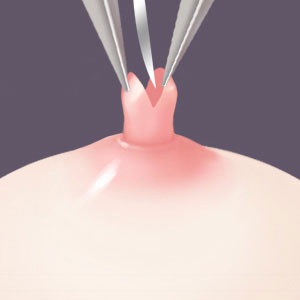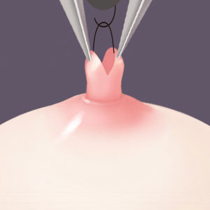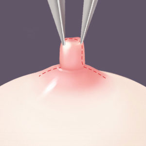 乳頭周辺に小さな切開口を作り、乳管と繊維組織を引っ張り突出させます。 皮弁を利用して、陥没されないように固定してから、縫合する方法です。 手術後、再発する可能性が低く、傷跡もほとんど残らず、キレイな形を作ることができますが、乳管を損傷する可能性があり、母乳の授乳が難しくなることがあります。