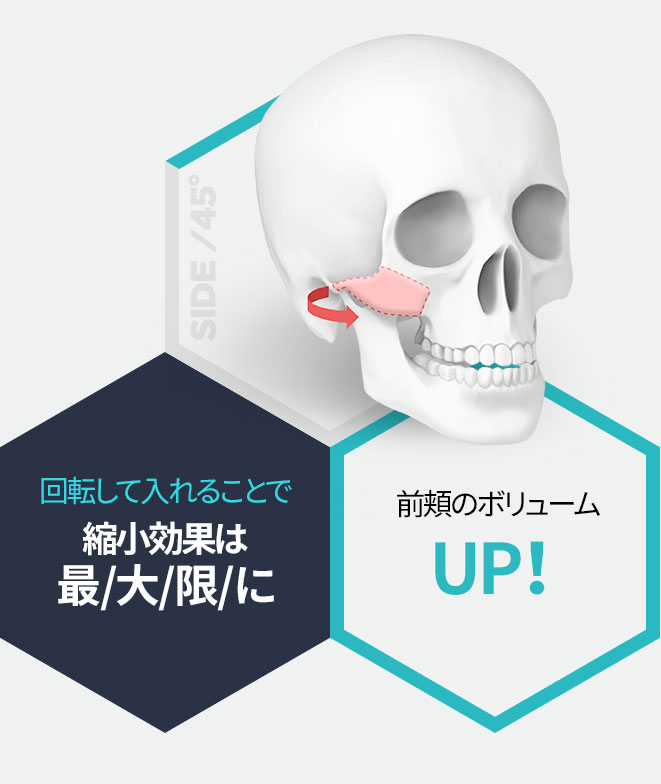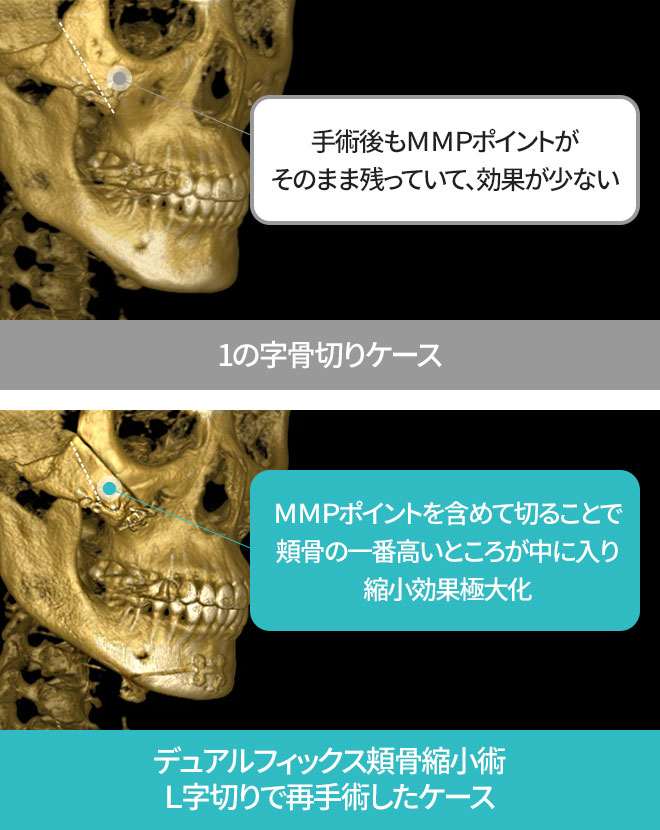 デュアルフィックス頬骨縮小術はMMPポイントを剥離することなく TSだけのL字切り技術で目の近く、必要な部位だけ精巧に剥離してから 切った頬骨を回転移動させ、手術後の頬の垂れを防止します。