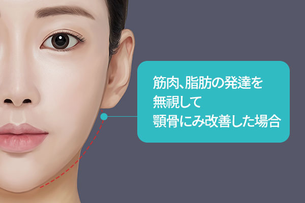 側面だけでなく、正面からもシャープな効果を得る為に 顎骨の除去以外にも脂肪と皮質骨除去および軟部組織縮小を平行する