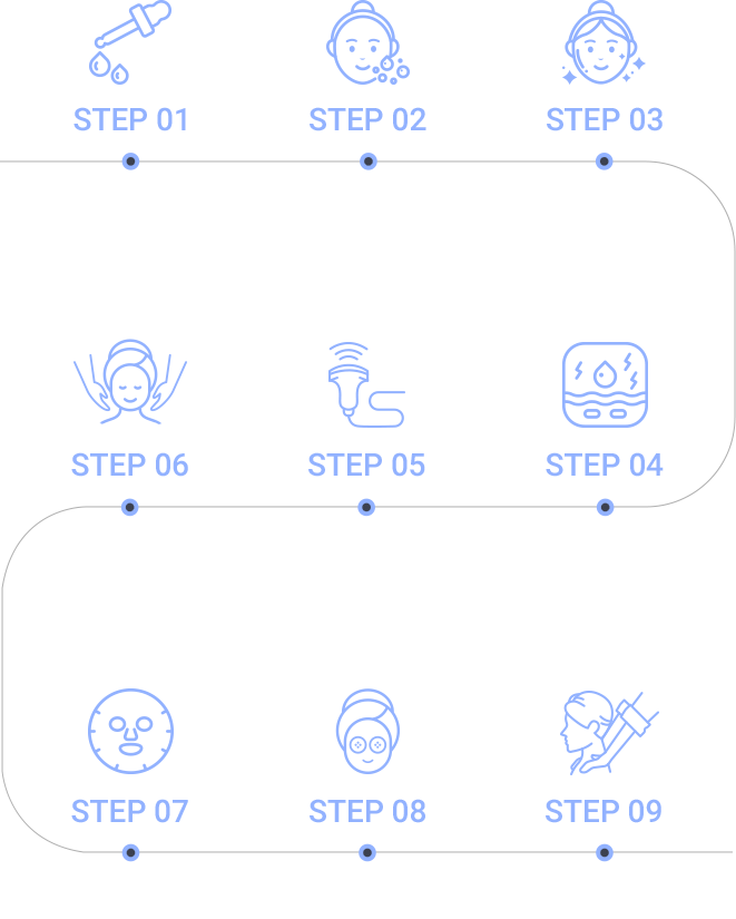 目、鼻の手術後、より早い回復および腫れ除去の為、機器テラピーと一緒に 手技マッサージで皮膚全体のトーンを明るくするプログラムになります。 しっかりした角質除去とアンプル保湿段階から、腫れ除去に効果的なポイントマッサージまで繊細に行います。