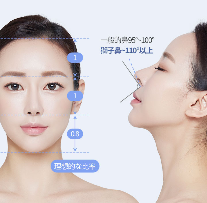 短い鼻/獅子鼻は横から見た時に一般的鼻より鼻唇角が110°以上大きい場合を言い、 正面から見た時も、鼻孔の中が全部見えるくらい鼻尖が上がっているのが特徴です。