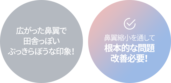 鼻翼が広がっていると、鼻筋が通っていても全体的に低く、短く見えるので、顔の立体感も落ちて見えます。 TSの鼻翼縮小は顔全体のバランスと理想的な鼻翼の比率を考慮し、オーダーメイド手術を行います。