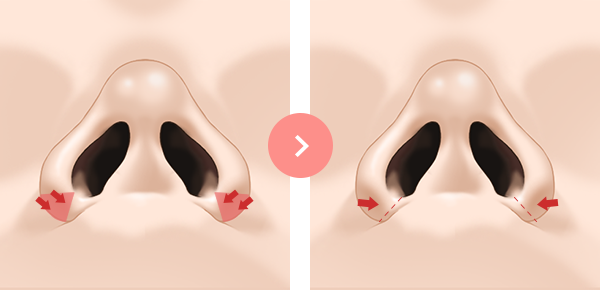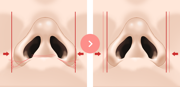 鼻翼の広がりがそこまでひどくなく、鼻孔も大きくない場合。 鼻孔の内側を微細に切除し、両方の鼻孔の間を糸で縛りながら鼻翼を中心に集める方法です。 傷跡がほとんど残らず、回復も早いですが、再発の可能性があります。。