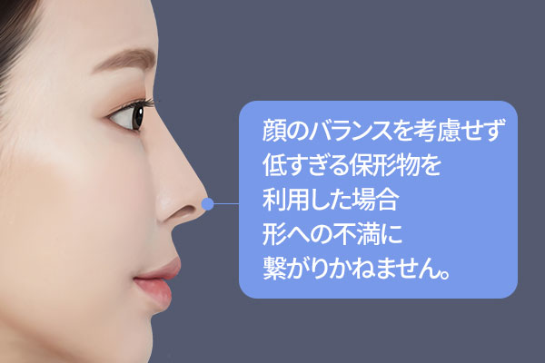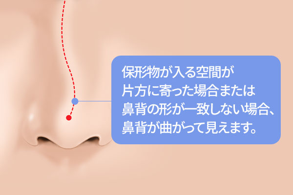 本人の鼻に合う適切な高さのシリコンに交代します。 鷲鼻が原因になっている場合は、出っ張った部分を削り 顔のバランスを考慮しながら、適合な保形物を挿入します。